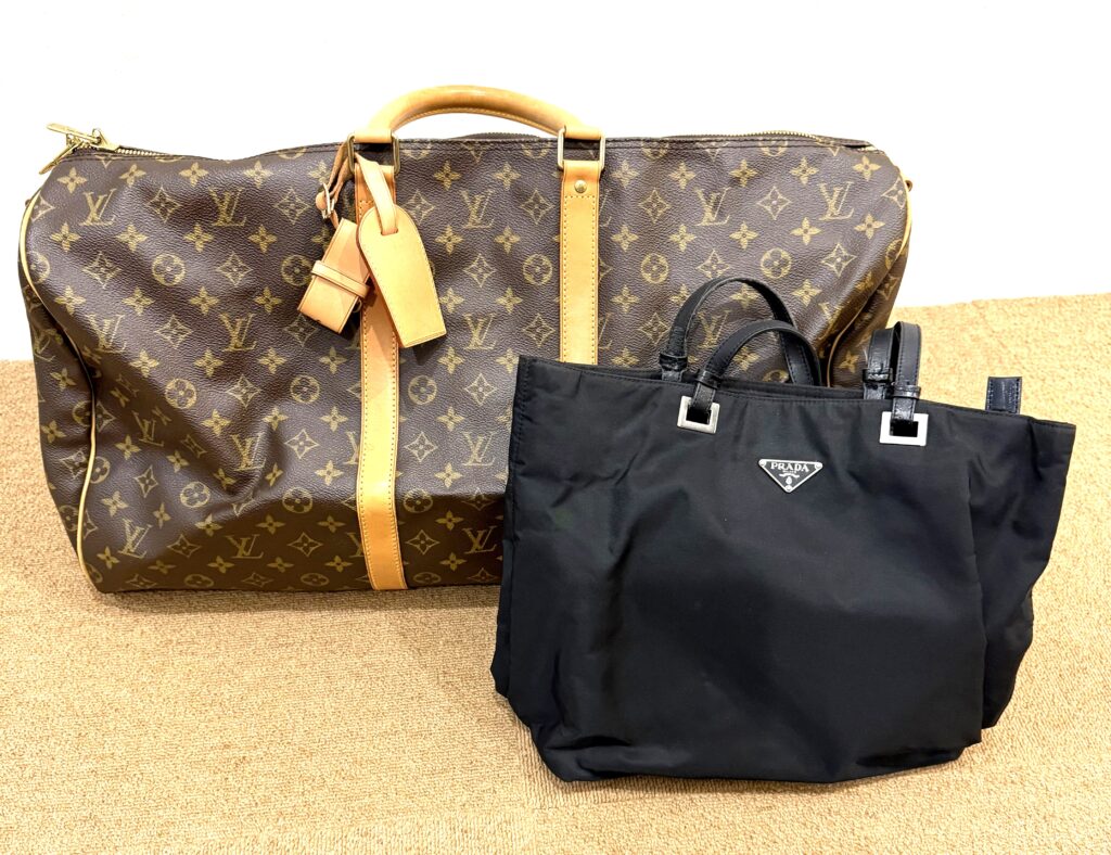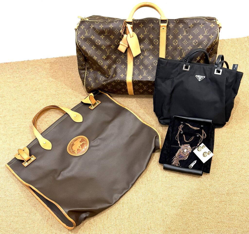 ヴィトン・プラダ・ハンティングワールドのバッグと、アクセサリーを3点お買い取りさせていただきました。ご家族のお家を整理されていて見付けた、今は使われなくなった品物だそうです。