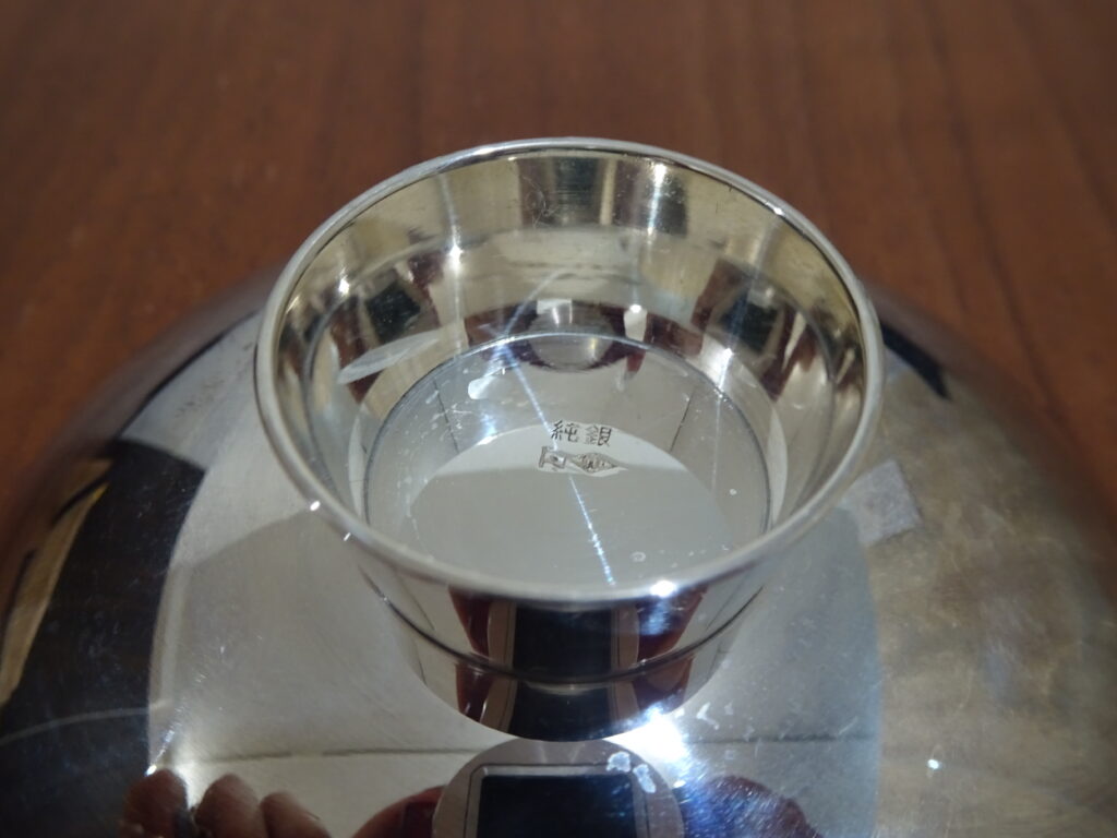 昭和の頃は勤続○○年とか功労者表彰の副賞としてこのような杯(さかずき)が贈られることもあったため、お持ちの方もいらっしゃるのではないかと思います。メッキの物はお買い取り対象外ですが、写真のように【純銀】や【日本国旗+純度】の刻印がある物は貴金属としてのお買い取りができる可能性がございます。ご自身で判断できない物はこちらで真贋致しますので、一度お持ち込みくださいませ。