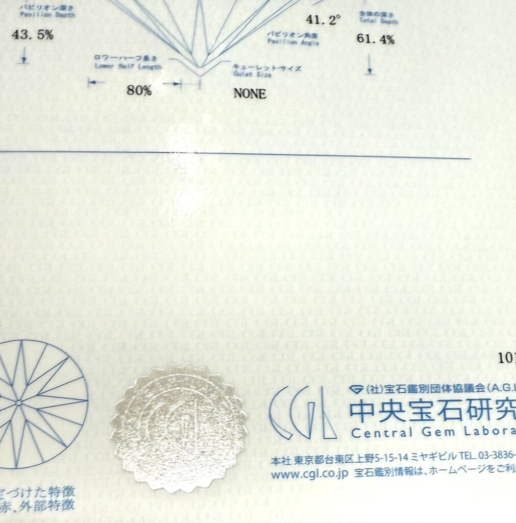 6月頃からプラチナ相場が高騰しております。そのことを皆さまご存知のようで、プラチナジュエリーをお持ちいただくことが多いです。貴金属は高価お買い取りの対象となることが多いですが、付属しているお石にも価値のあるものがございます。今回のリングにはダイヤモンドのグリーティングレポート(鑑定書・鑑別書)が付いていましたので、Pt950の価値にダイヤモンドの価値がプラスされて査定いたしました。もしお客様が何かお石の付いているジュエリーを売却されるご予定でしたら、グリーティングレポートがあるのであれば一緒にお持ちいただく方が査定がスムーズに進みます。もちろんジュエリーだけでも真贋査定できますので、どうぞお持ちください。